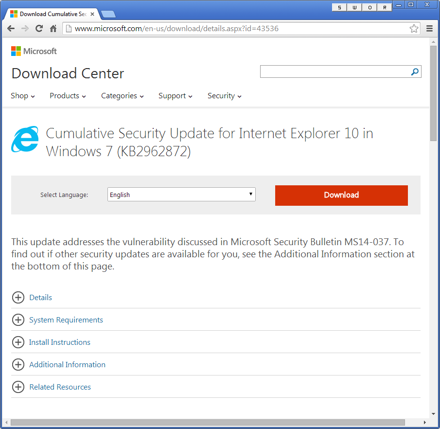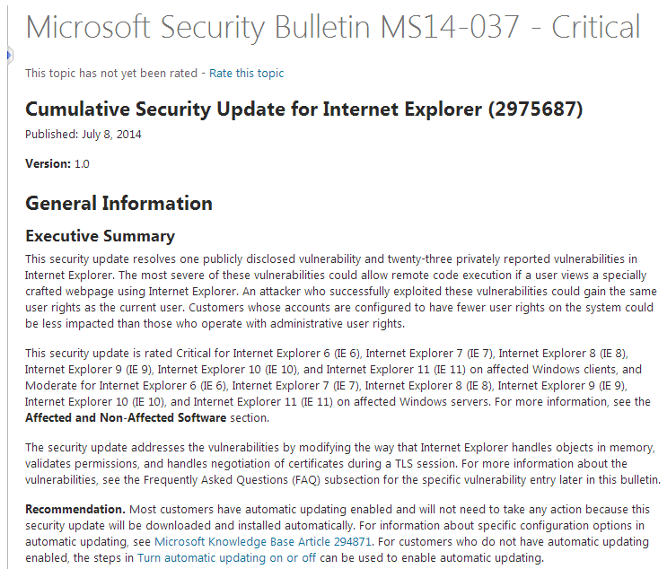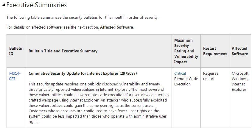 3. Click the link in the Bulletin ID field. The Security Bulletin for that patch opens. In this example, Security Bulletin MS14-037 opens: