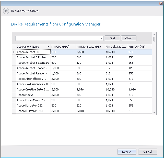 The Device Requirements from Configuration Manager panel lists those applications in the System Center 2012 Configuration Manager server that have defined device requirements. Select the application in the list that matches the one that you are editing, and click Next to continue.