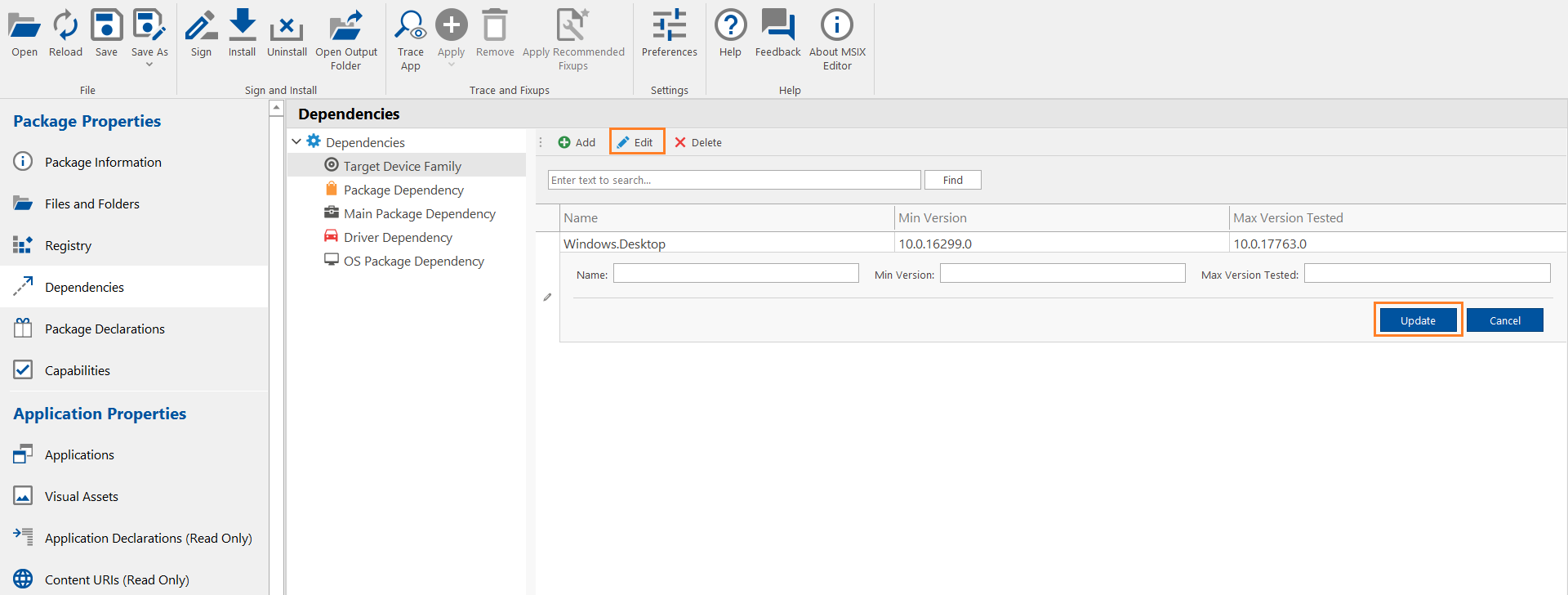 To edit, select the desired dependency, and then click the Edit button. The selected dependency is now enabled. Modify the desired fields and then click the Update button to save the changes.